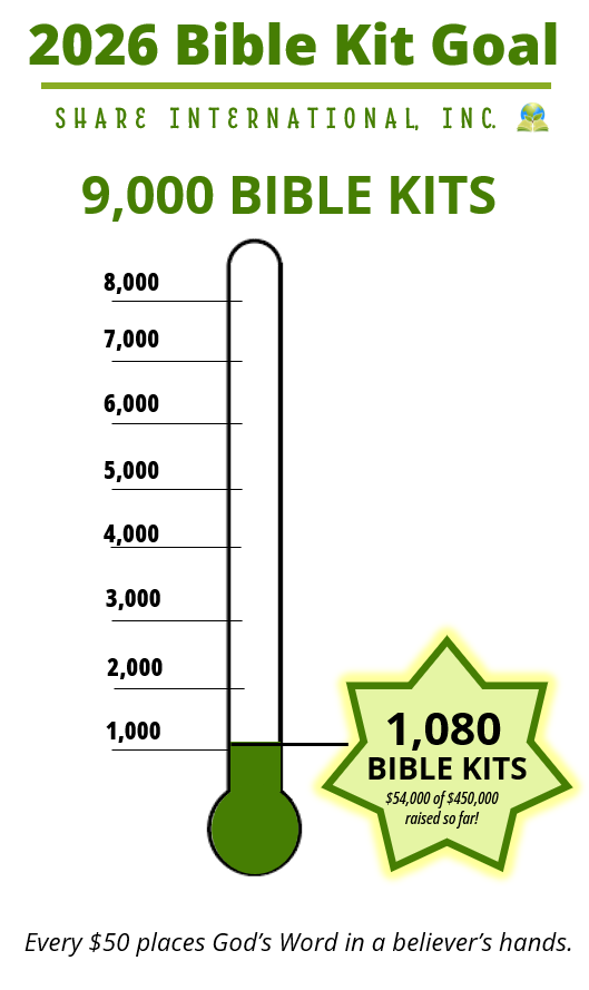 We are at an exciting time in the Share ministry. As the indigenous leaders continue to advance the mission and vision of Share, we in the US can now support them by providing the tools needed to sustain and accelerate the disciple-making movement that was launched nearly 30 years ago. Won’t you come alongside us in this endeavor? Be a part of the 3-year, 25,000 Bible Kit goal? Kindly make your donation toward any number of Bible Kits to help us finish the task of reaching the unreached for Christ and building up the Body of Christ throughout East Africa.